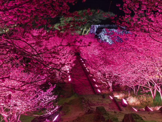 特徴: 世界遺産「今帰仁城跡」で開催される桜祭り。美しいカンヒザクラとライトアップされた城壁が幻想的な風景を作り出します。