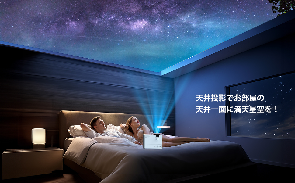 最大の魅力は天井投影!ベッドに寝転んだまま映画鑑賞ができるのは至福。台形補正で映像もまっすぐ整います。