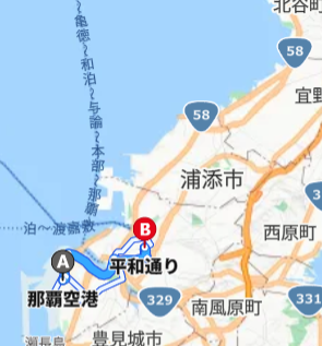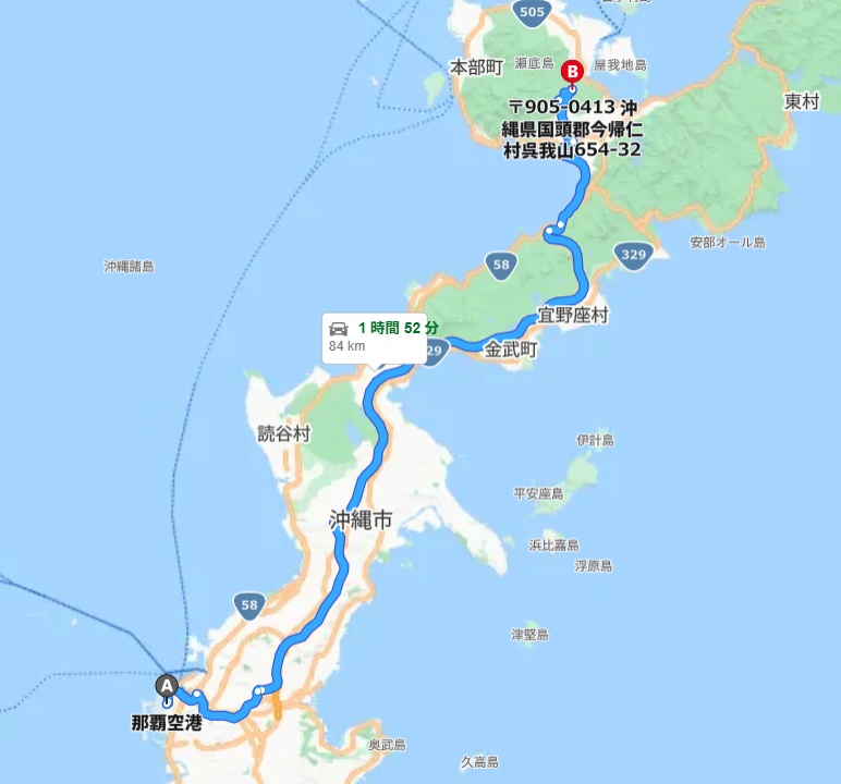出発:那覇空港→ 沖縄自動車道経由 → 国道58号を北上 → 到着:ジャングリア沖縄