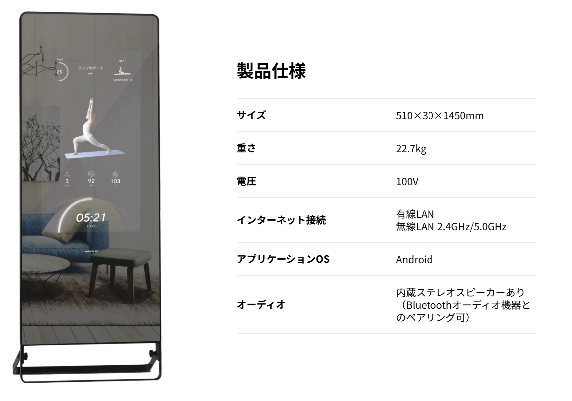 ミニマルなデザインで、お部屋のインテリアに馴染む点も魅力の一つです。使用していない時は、通常の全身鏡として活用可能。スマートデバイスでありながらも、生活空間に溶け込む美しい仕上がりです。