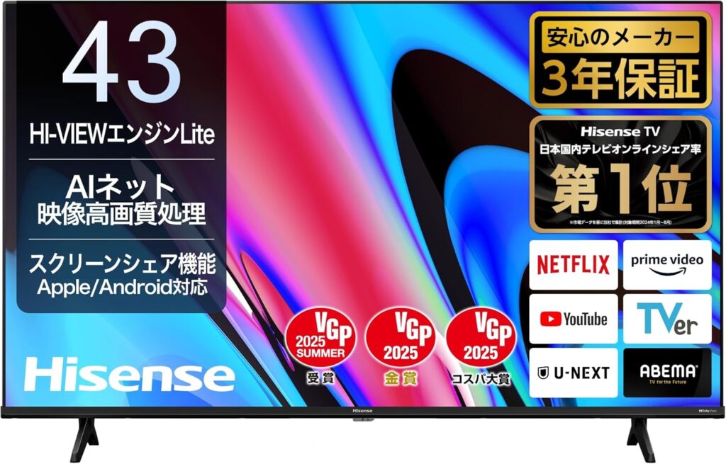 🔍 製品概要 項目内容ブランドHisense(ハイセンス)モデル名43E60N(2024年モデル)サイズ43V型(43インチ)解像度4K UHD(3840×2160)価格帯約45,000〜55,000円前後(Amazon価格)評価★4.2(192件以上のレビュー、2024年時点)保証3年保証(Amazon.co.jp... -