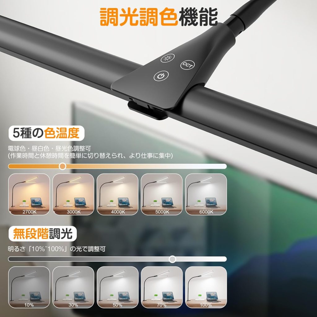 また、ダブル光源設計のおかげで、光が広がりやすく、均等にデスク全体を照らすことができます。これにより、作業場所全体を明るく保ち、手元だけでなく周囲の視界もクリアになります。特に、目に優しい設計がされているので、目の負担を減らし、長時間使っても疲れにくいのが大きなポイントです。